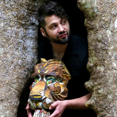 Derek Weidman, b. 1982, lives in rural Pennsylvania. Initially studying philosophy in college, but a born artist, he choose to follow in the path of his father who was a bird carver. When he began turning, he approached the lathe as a sculptor, primarily exploring and pushing the boundaries of multi-axis turning with a mixture of german ring turning added in. His main effort was trying to create a visually descriptive and versatile language born out of the arcing and circular cuts of a lathe. At the heart of his work he treats the lathe almost as an unusual camera, with every subject passing through its lens adding to a visually novel circular zoo of wildlife.
